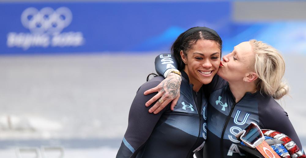 2022年2月19日,美国选手凯莉·汉弗莱斯(右)和队友凯莎·洛夫在北京冬奥会女子双人雪车比赛后。新华社记者 姚剑锋 摄